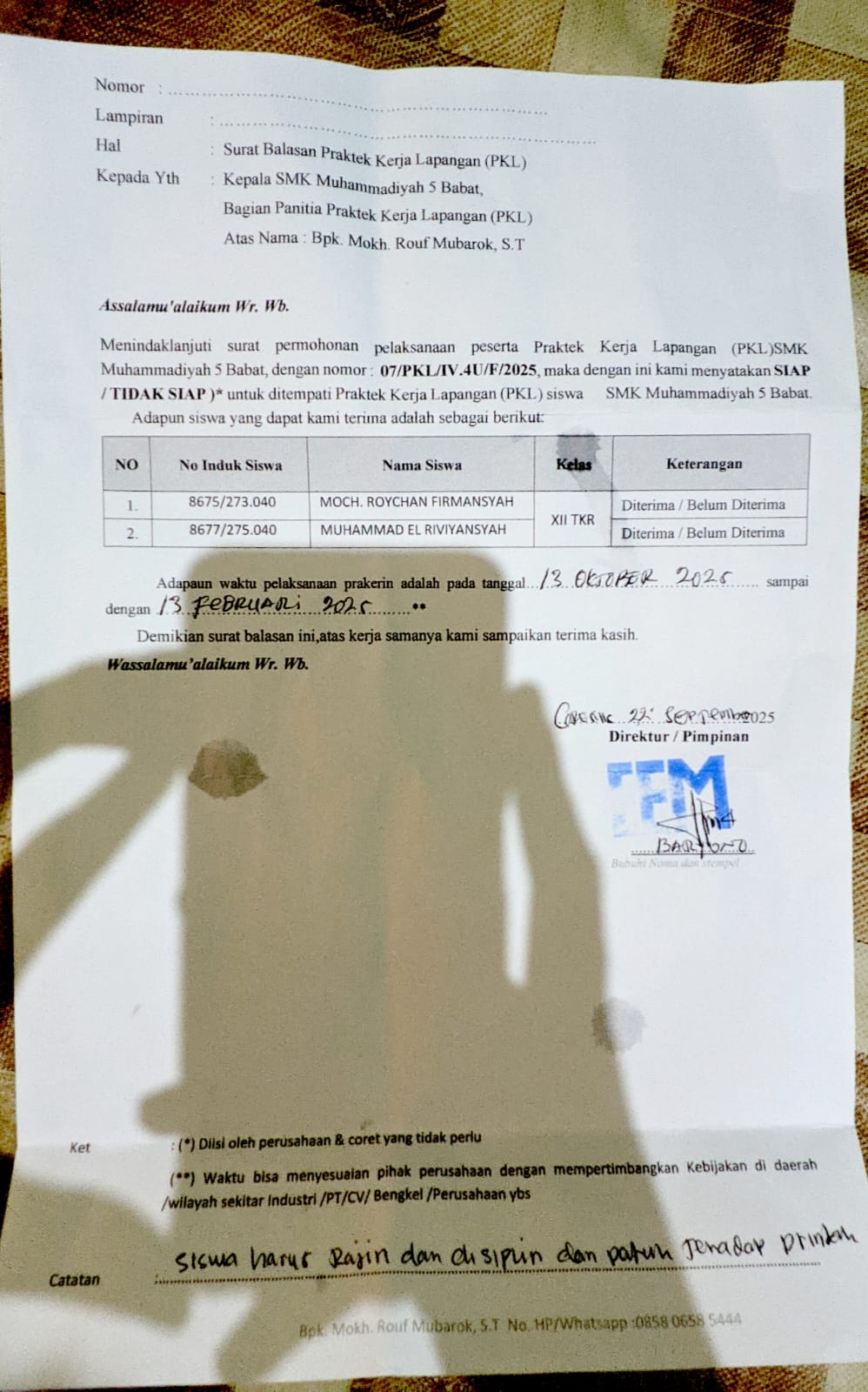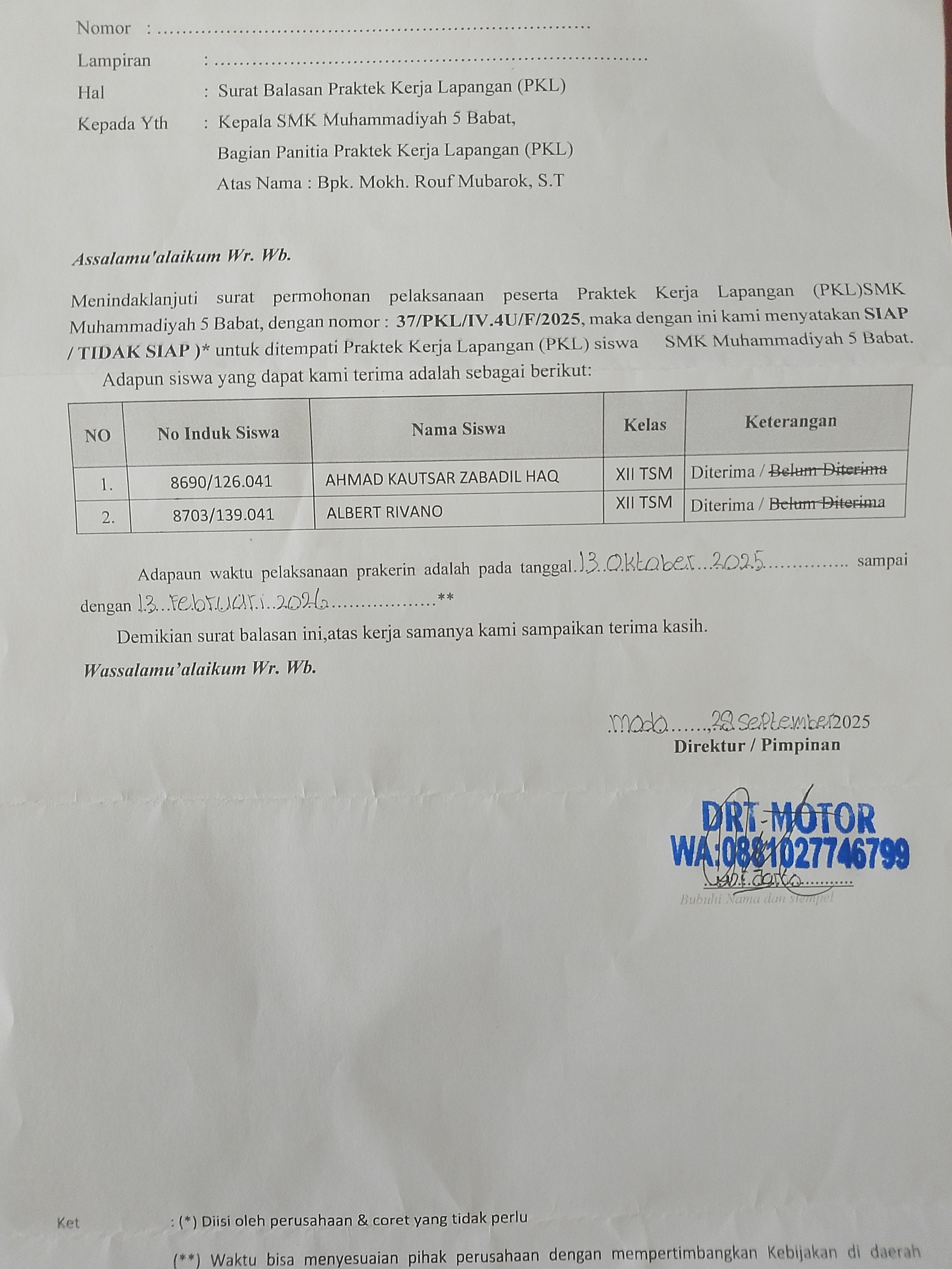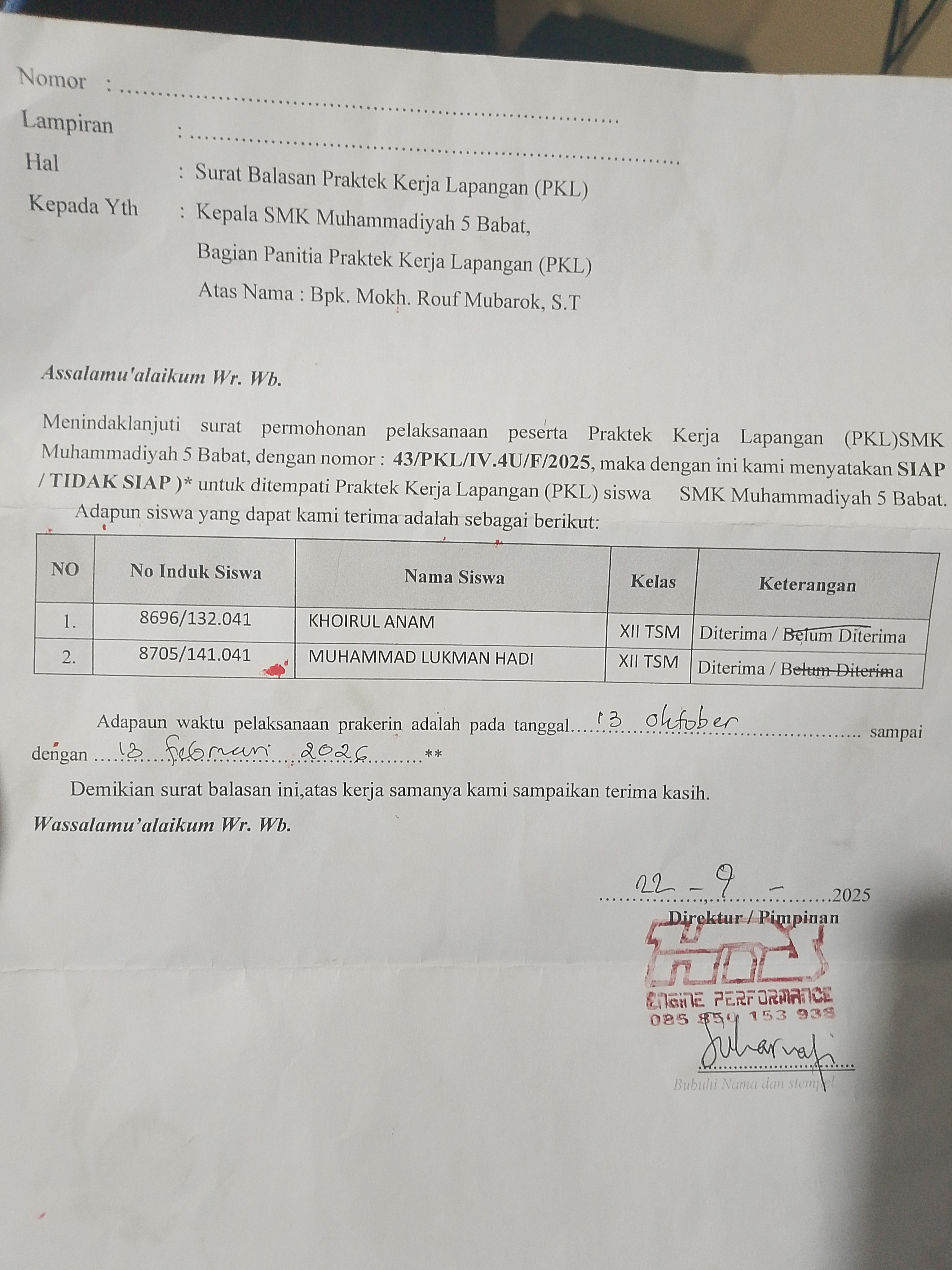 BERKAH Motor Jl. Gotong Royong, Sawo, Babat, Kec. Babat, Kabupaten Lamongan, Jawa Timur 62271 Mas Antok No WA Pembimbing Iduka: 0811939716448 Lihat File Upload Lihat File Balasan |