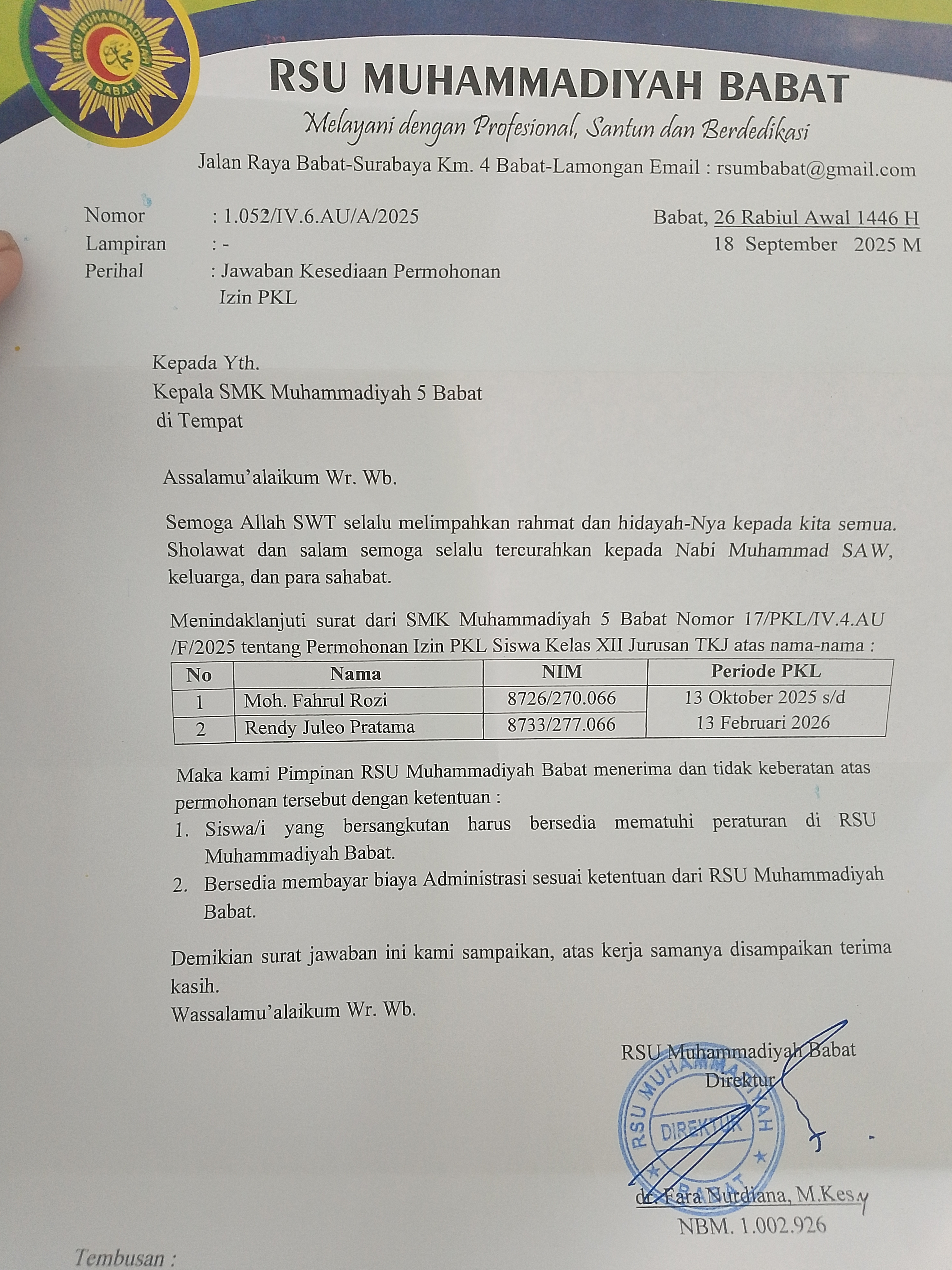 RSU Muhammadiyah Babat Jl. Raya Babat - Surabaya No.Km. 4 Babat Kec. Babat, Kabupaten Lamongan, Jawa Timur 62271 Lihat File Upload Lihat File Balasan |