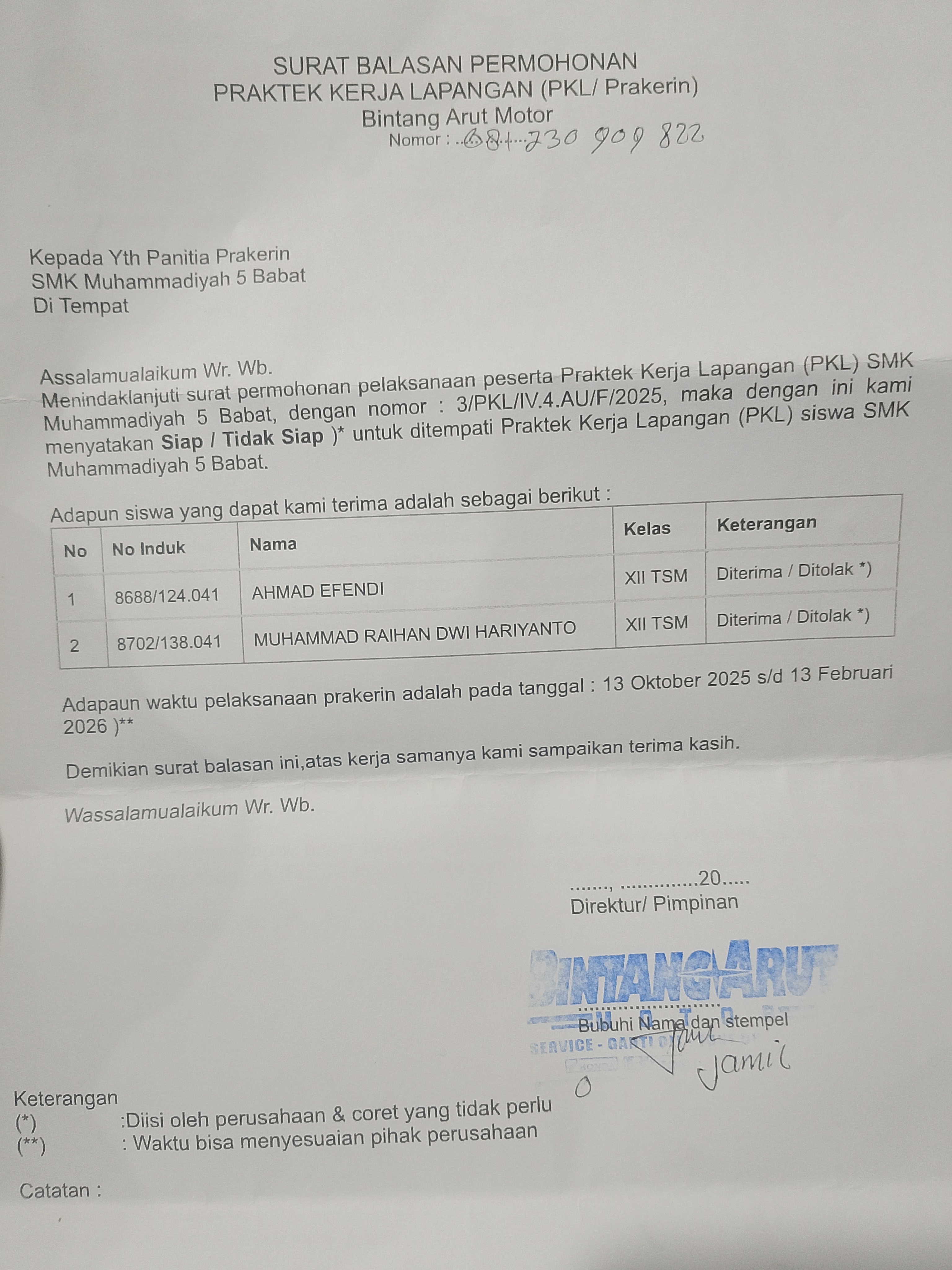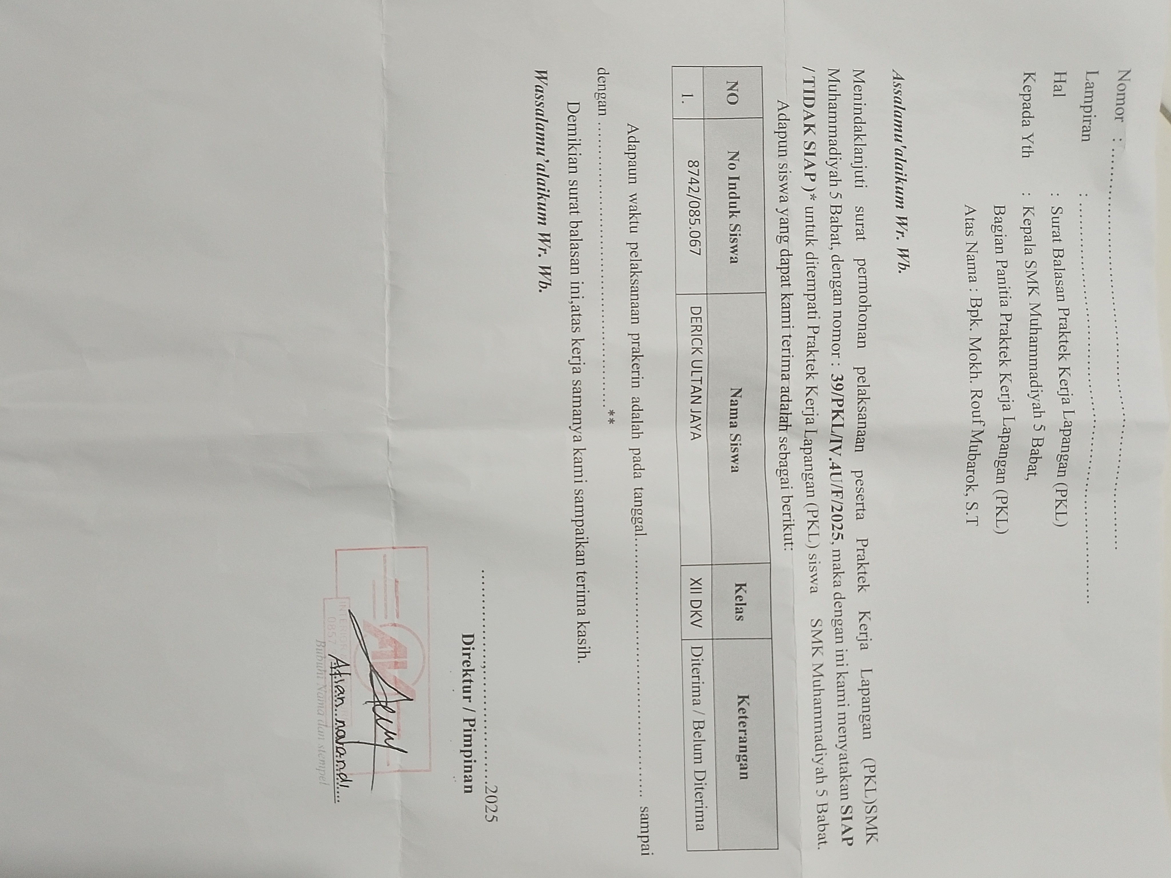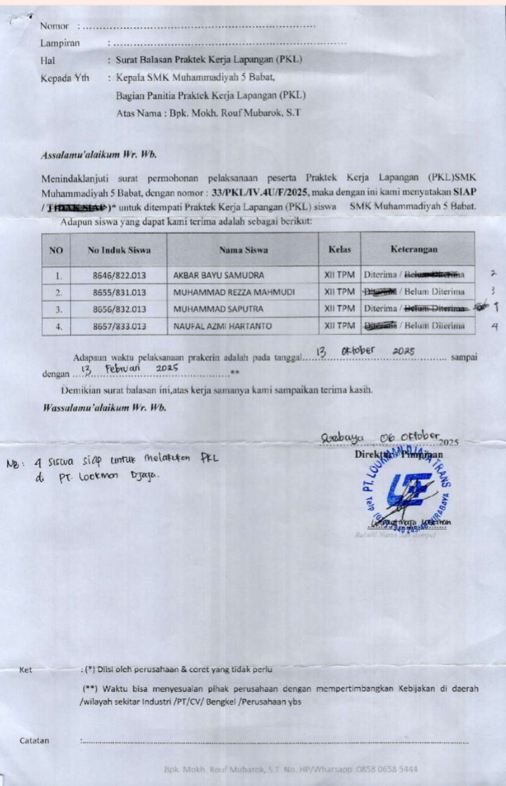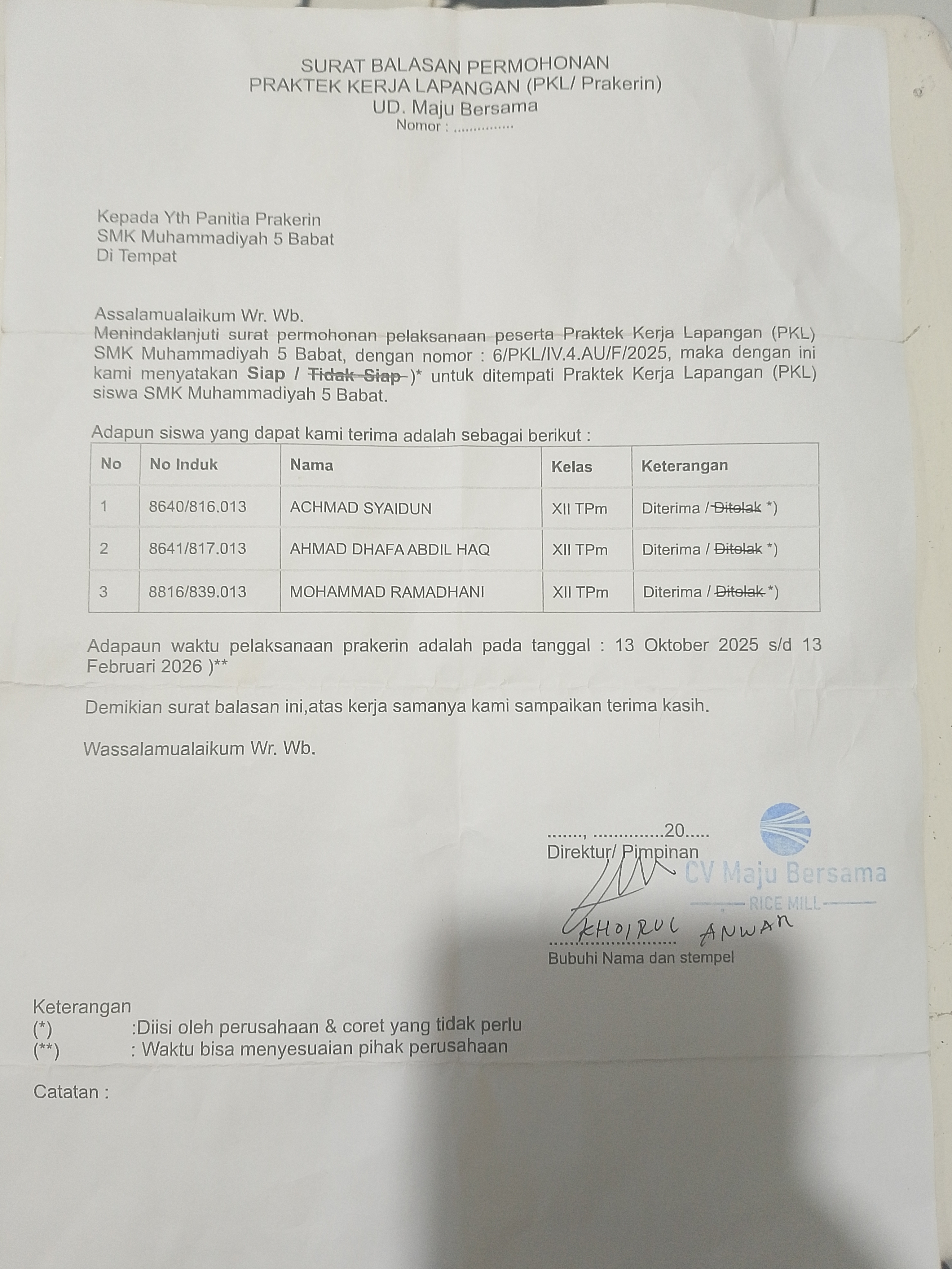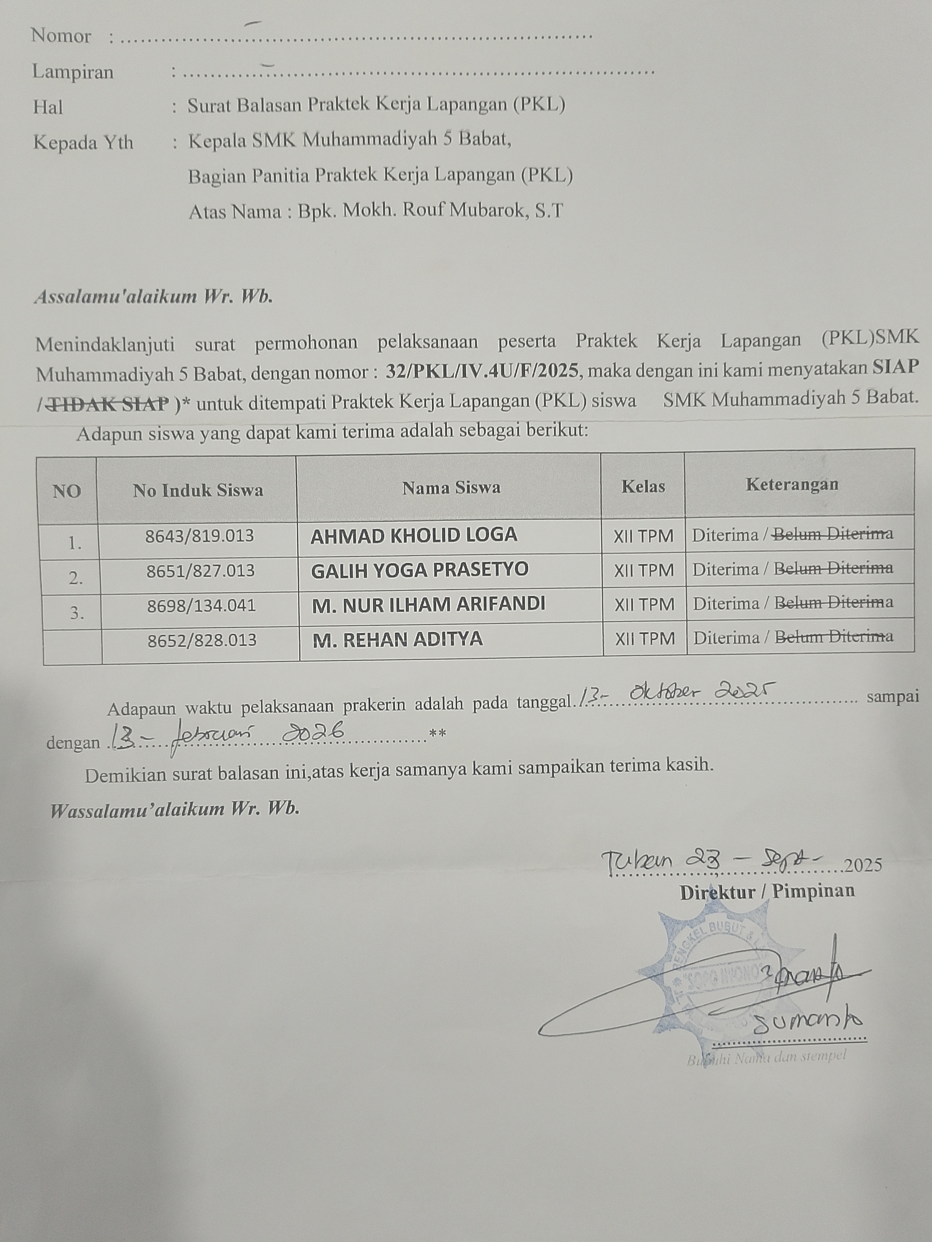 CV. Maju Bersama_ RT 4 RW 2 Ds. Bandungrejo Kec. Plumpang Kab. Tuban 13 Oktober 2025 s/d 13 Februari 2026 Lihat File Upload Lihat File Balasan |