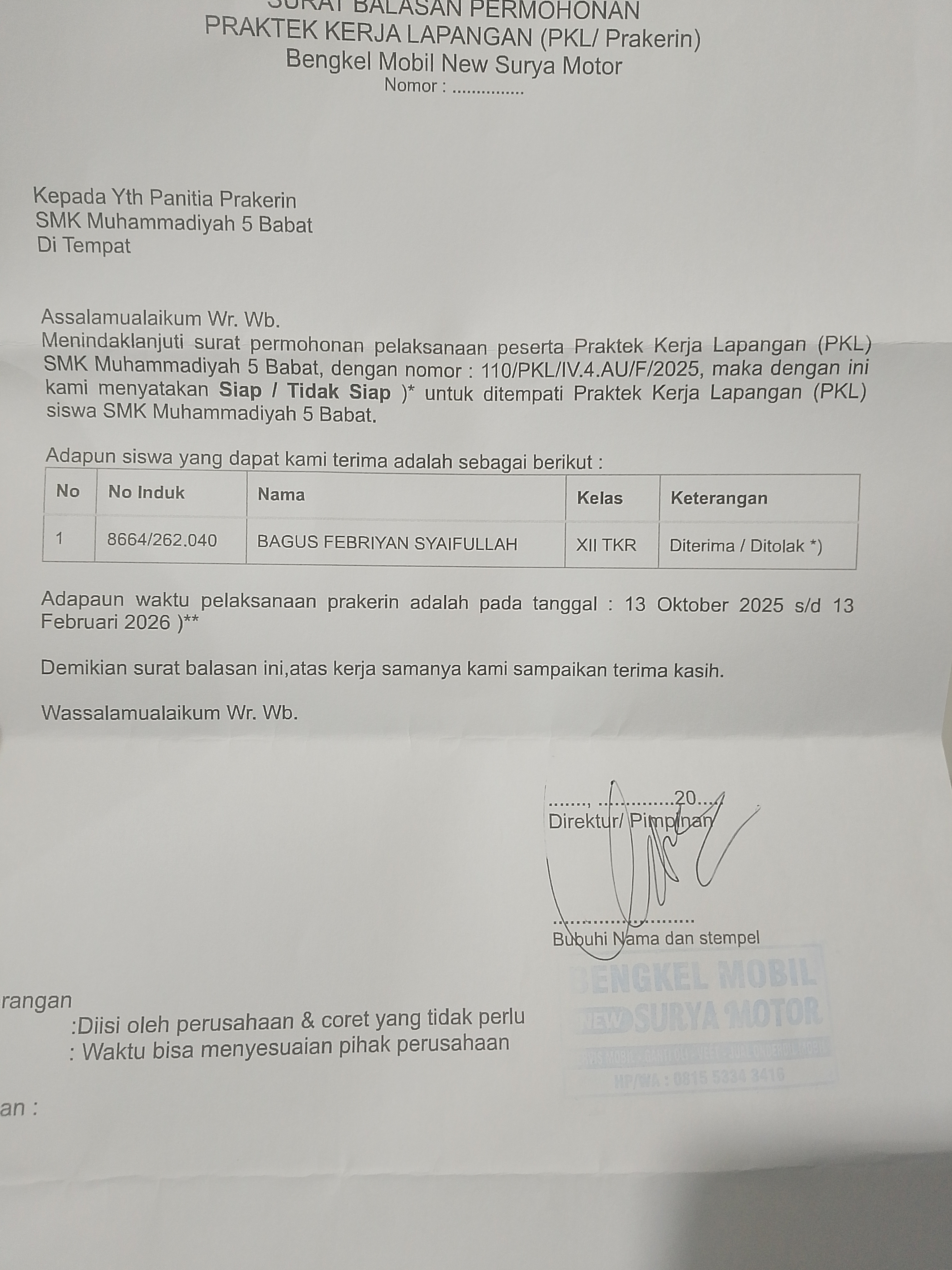 Bengkel Mobil New Surya Motor_ Jl. Babat - Jombang No.KM 14, Wates/ Jubak, Nguwok, Kec. Modo, Kabupaten Lamongan Lihat File Upload Lihat File Balasan |