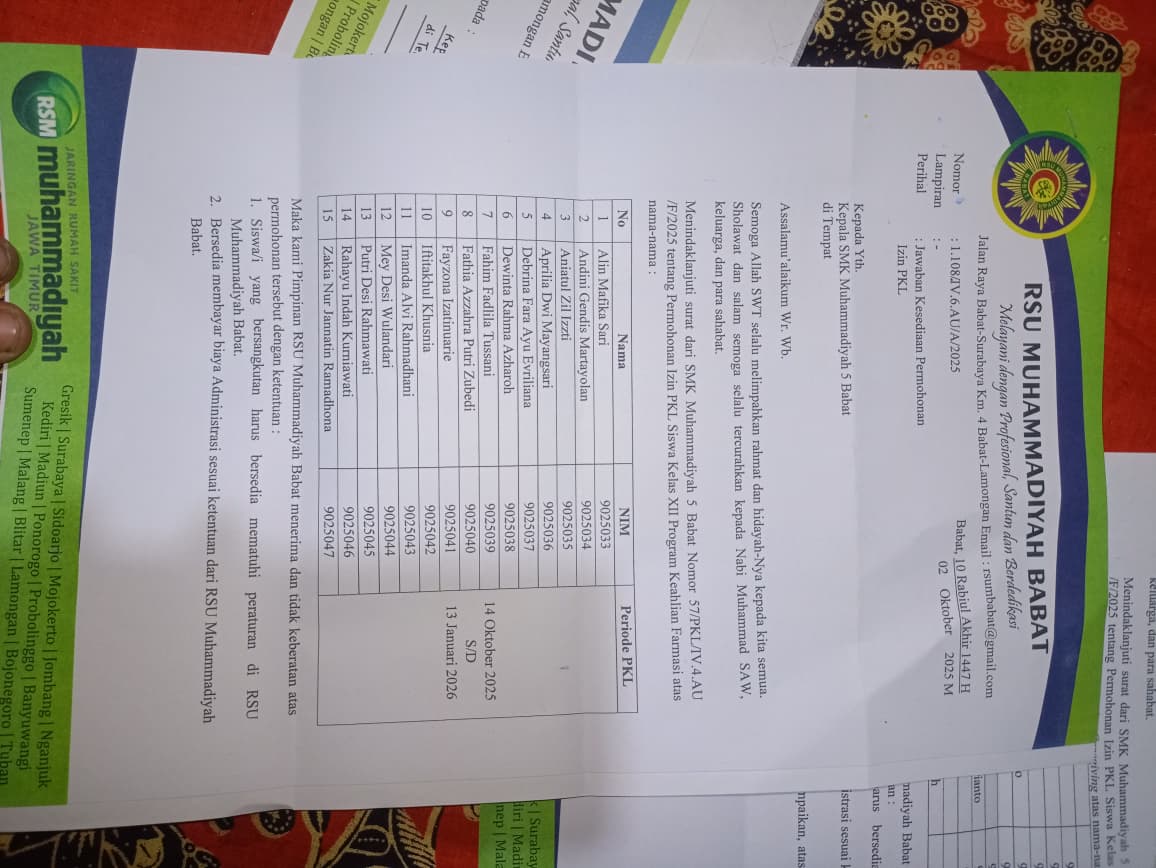 RSU Muhammadiyah Babat Jl. Raya Babat - Surabaya No.Km. 4, Kebalan Pelang, Kebalanpelang, Kec. Babat, Kabupaten Lamongan, Jawa Timur 62271 Apt. Fathin Istiadzah, S.Farm 085816622124 Lihat File Upload Lihat File Balasan |
